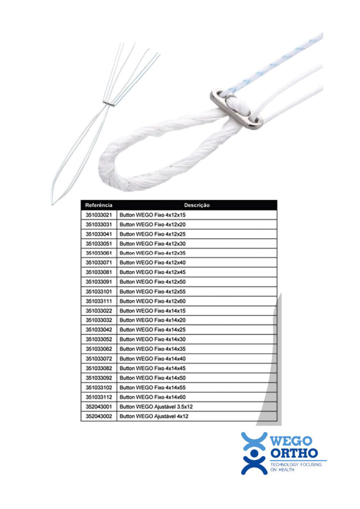 O Button WEGO é um dispositivo médico implantável, composto por três partes interdependentes: loop, placa e fios de sutura. Disponível nos modelos Fixo e Ajustável, sua principal diferença reside na capacidade de ajuste do loop, proporcionando maior precisão na fixação do enxerto. Para procedimentos de revisão, o Button WEGO de Revisão atua como acessório complementar, ampliando a superfície de contato entre a placa do dispositivo e o tecido ósseo, sem necessidade de procedimentos adicionais ou modificações no implante.
